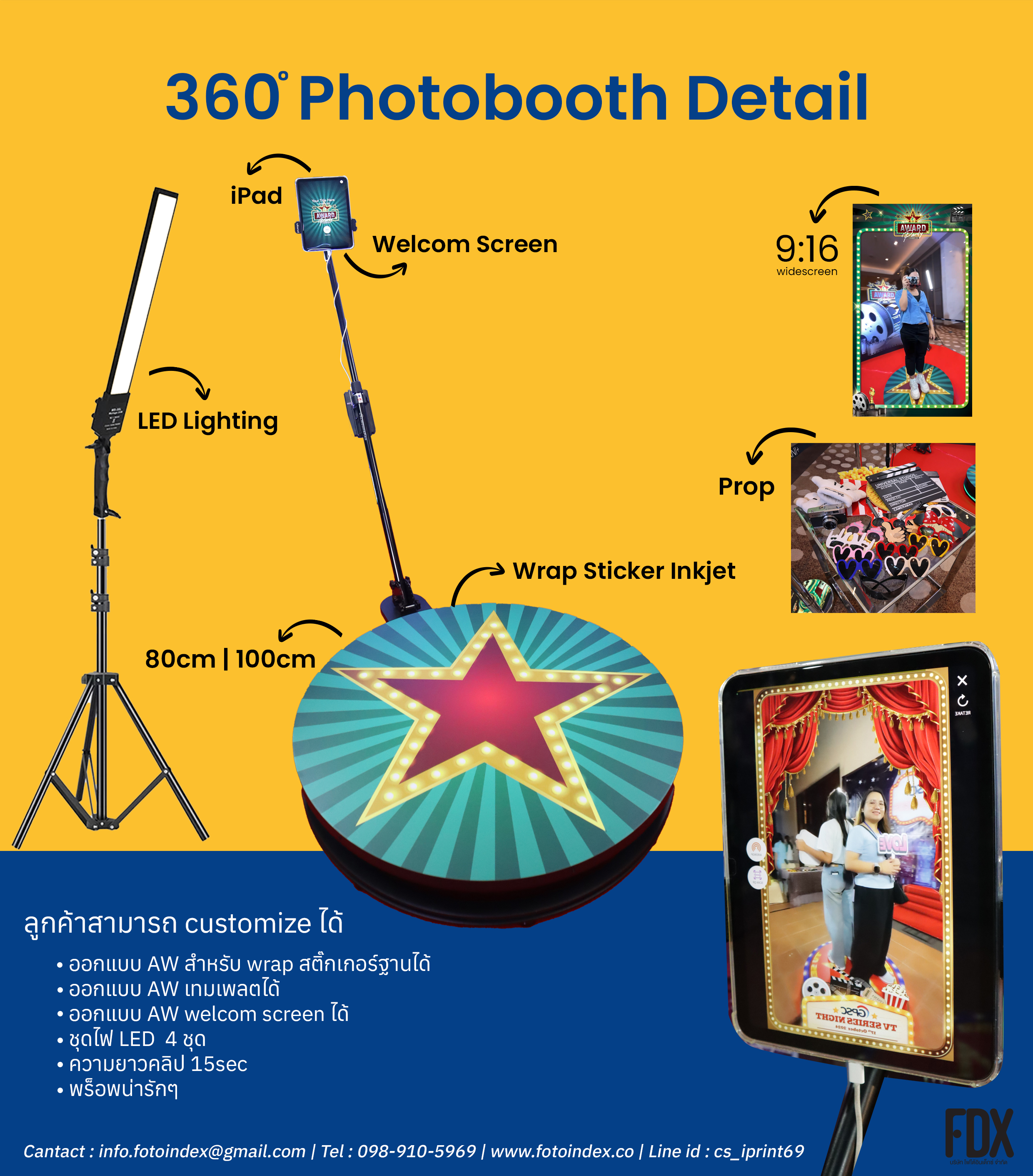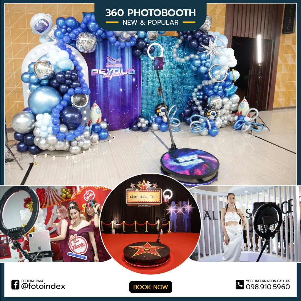 บริการ 360 Photo Booth บูธถ่ายภาพถ่ายวีดีโอแบบ 360 องศา สำหรับงานอีเว้นท์ ปาร์ตี้ งานเลี้ยง งานแต่งงาน งานกาล่า ฯลฯ มีให้เลือกใช้บริการ 2 ขนาด แบบ 80 ซม. (เล่นได้ 1 – 3 คนต่อครั้ง) และ ขนาด 100 ซม. (เล่นได้ 1 – 4 คนต่อครั้ง) โดยการทำงานและควบคุมผ่าน iPad สามารถเรคคอร์ดวีดีโอได้ไม่เกิน 15 วินาที เพื่อเพิ่มความสวยน่าสนใจให้วีดีโอลูกค้าสามารถเลือกใส่โลโก้หรือเทมเพลตได้ด้วย หลังจากถ่ายเสร็จสามารถ Airdrop หรือ สแกน QR Code ให้ทันที