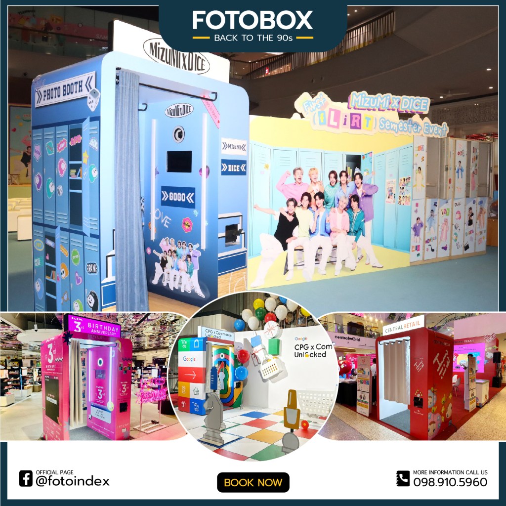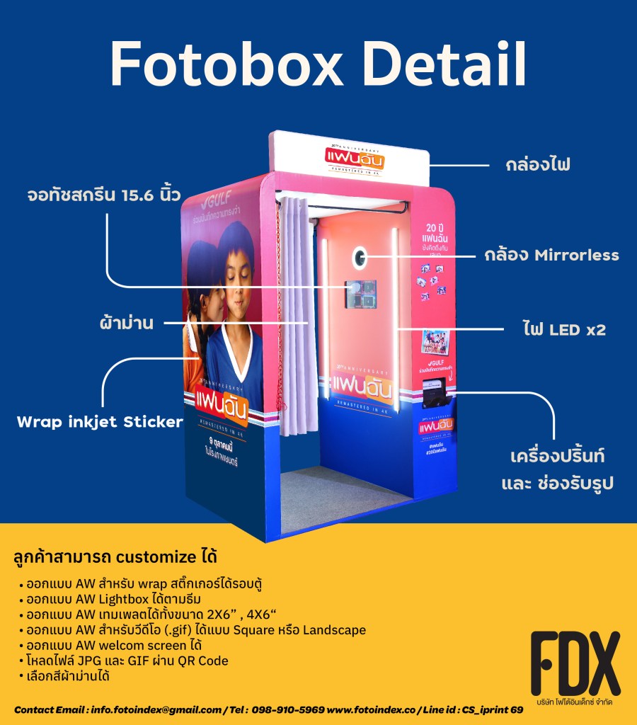 FOTOBOX บริการตู้ถ่ายภาพสติ๊กเกอร์โฟโต้บ๊อกซ์ ย้อนเวลาพาทุกคนสู่ยุค 90 ซึ่งตู้ถ่ายรูปสติ๊กเกอร์ได้รับความนิยมเป็นอย่างมาก เรานำโฟโต้บ๊อกซ์กลับมาให้ความสนุกอีกครั้ง ด้วยแบบตู้ที่ wrap ได้ตามธีมงาน พร้อมป้ายไฟ บวกกับฟังชั่นก์สนุกๆ กับการถ่ายแบบเซลฟี่ ตกแต่งรูปภาพหรือโทรสีได้ พร้อมกับดาวน์โหลดไฟล์ .jpg และ .gif ได้ทันทีหลังถ่ายเสร็จ (เลือกขนาดรูปปริ้นท์ได้ทั้ง 2X6 นิ้ว และ 4X6 นิ้ว)