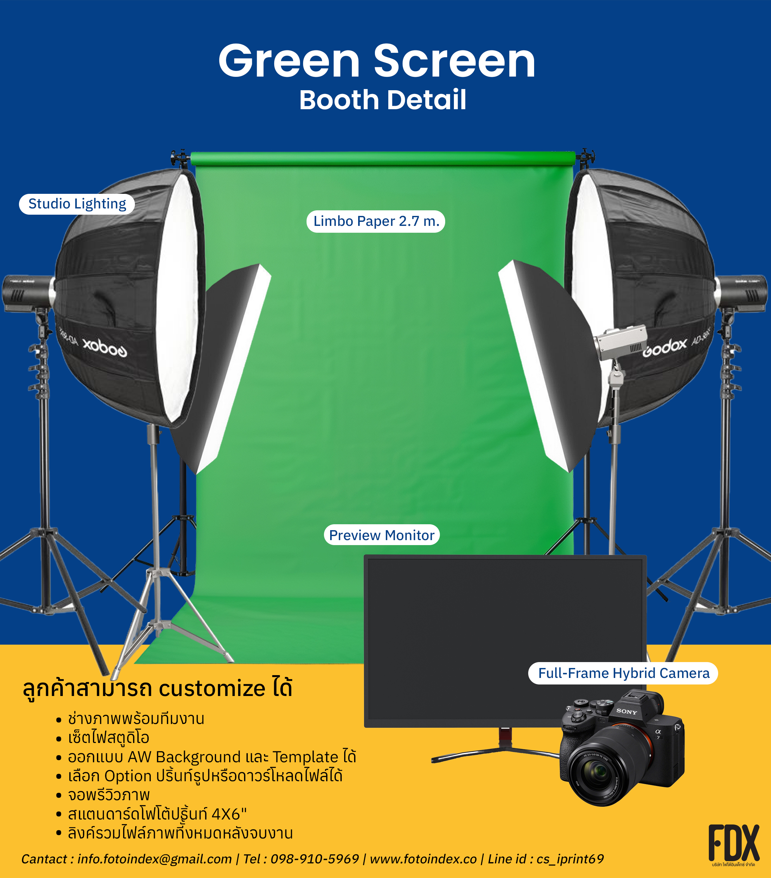 Greenscreen Photo Booth : กรีนสกรีนโฟโต้บูธ บริการถ่ายภาพกรีนสกรีนโฟโต้บูธตัวช่วยข้อจำกัดเรื่องฉาก การถ่ายภาพโดยการใช้ฉากแบบเดียวตลอดงานจึงไม่จำเป็นอีกต่อไป เพราะลูกค้าสามารถเลือกเปลี่ยนแบบฉากหลังได้หลากหลายแบบในงานเดียว