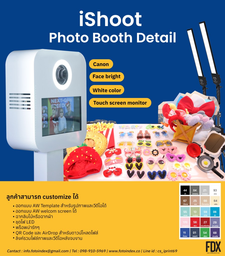 iShoot Photo Booth : บริการสเตชั่นถ่ายภาพเซลฟี่ 3 แอคชั่น ภาพสวยคมชัดด้วยกล้อง Canon พร้อมฉากลิมโบ้หลายเฉดสีหรือผ้ากลิตเตอร์ และพร็อพสนุกๆ หลากหลายแบบตามธีมงาน ชุดไฟ LED เพิ่มมิติภาพให้สวยยิ่งขึ้น