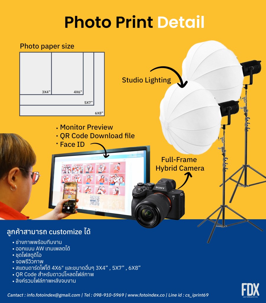 Photo Print : บริการถ่ายภาพพร้อมปริ้นท์โดยช่ายภาพมืออาชีพ จัดชุดไฟสตูดิโอ พร้อมจอพรีวิวให้ลูกค้าได้เลือกภาพที่ชอบก่อนปริ้นท์ นอกจากนี้ยังสามารถดาวน์โหลดไฟล์ผ่าน QR Code และ AirDrop ได้ทันที มีขนาดรูปให้เหลือกหลากหลาย 2X6″ , 3X4″ , 4X6″ , 5X7″ และ 6X8″ ฯลฯ